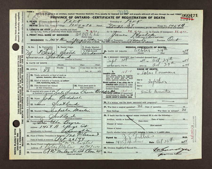 On 24th October, 1944, James Hyslop Boddell, age 83, a widower, of 1454 A, Yage Street, Toronto, Canada, died at home. his death was reported by his daughter Mrs Ella Boddell or Bryce, of same address. The cause of death was Pneumonia due to Infection.