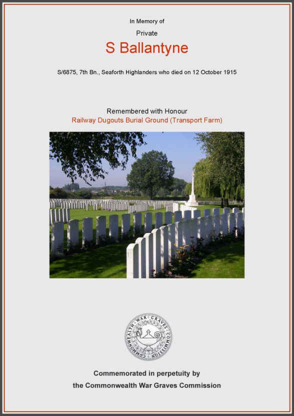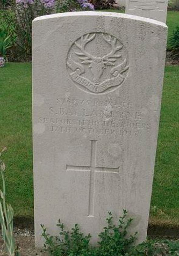 The Commonwealth War Graves Commission (CWGC) entry for SAMUEL BALLANTYNE shows that he is buried at RAILWAY DUGOUTS BURIAL GROUND (Transport Farm), Zillebeke, West Vlaanderen, Belgium. There