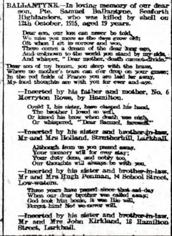 "BALLANTYNE - In loving memory of our dear son, Pte Samuel Ballantyne, Seaforth Highlanders, who was killed by a shell on 12th October, 1915, aged 19 years.
