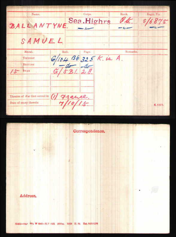 The Medal Rolls Index Card (MIC) for SAMUEL BALLANTYNE shows that he was awarded the 1914-15 Star Medal, the Victory Medal and the British War Medal.