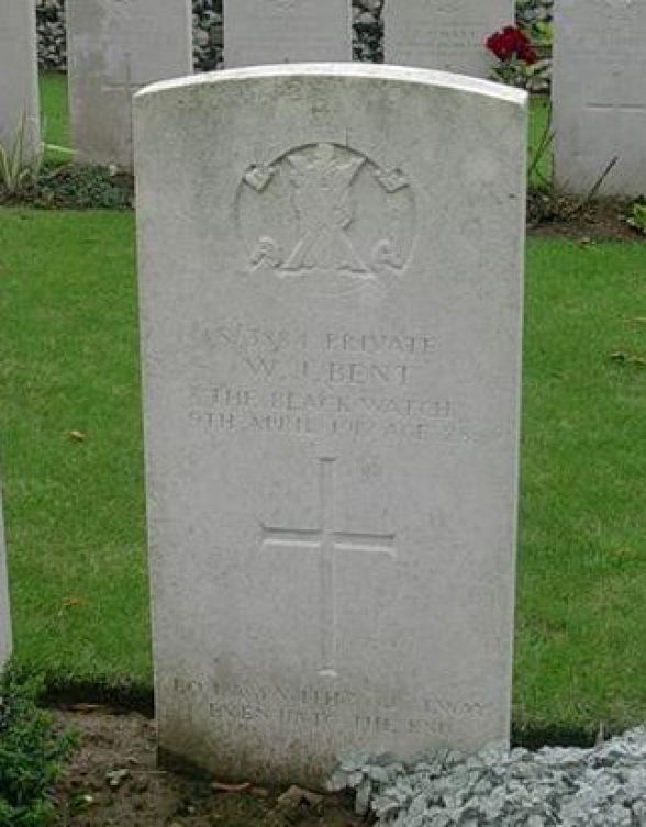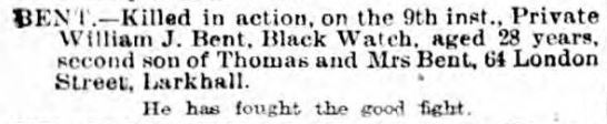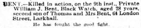 "BENT - Killed in action, on the 9th inst., Private William J. Bent, Black Watch, aged 28 years, second son of Thomas and Mrs Bent, 64 London Street, Larkhall.
