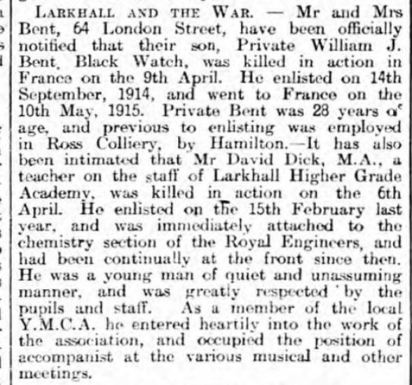 "LARKHALL and the WAR - Mr and Mrs Bent, 64 London Street, have been officially notified that their son, Private William J. Bent, Black Watch, was killed in action in France on the 9th April. He