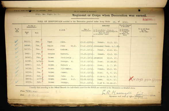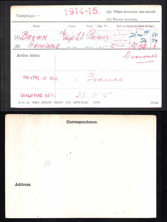 The Medal Rolls Index Card (MIC) for ARCHIBALD BROWN shows that he was awarded the 1914-15 Star Medal, the Victory Medal and the British War Medal. The MIC shows that he went to France on 23rd November, 1915.