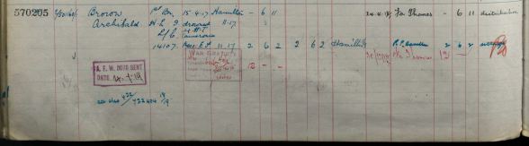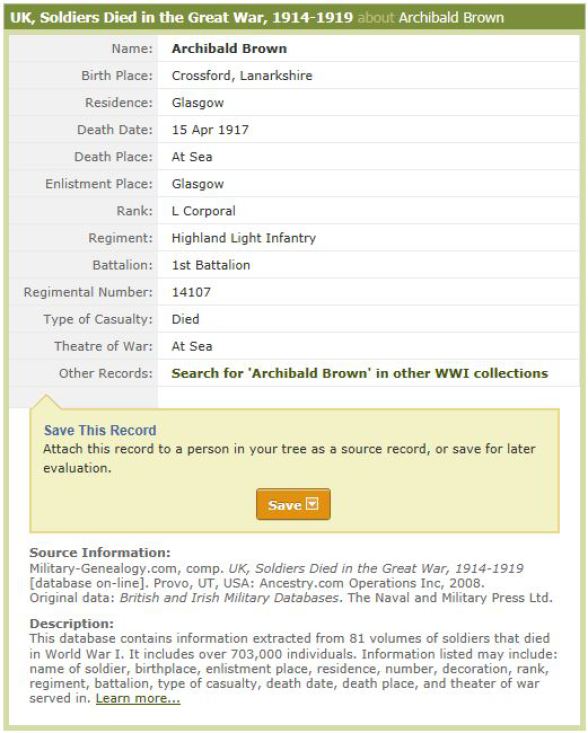 The entry in Soldiers Died in the Great War (SDGW) shows that ARCHIBALD BROWN was born at Crossford, Lanarkshire, and lived and enlisted in Glasgow.