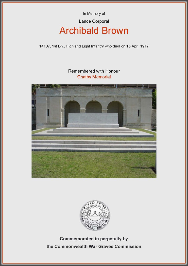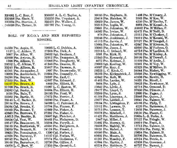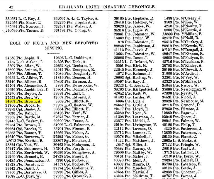 ARCHIBALD BROWN, Pte [sic] 14107, is listed amongst the missing in The HLI Chronicle of 1918.