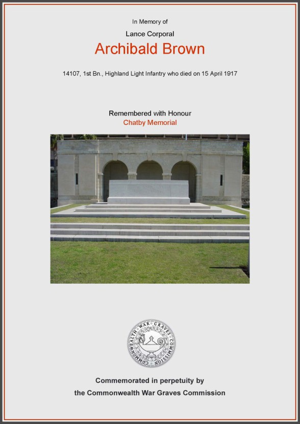 The Commonwealth War Graves Commission (CWGC) entry for ARCHIBALD BROWN shows that he is commemorated at CHATBY MEMORIAL, Alexandria, Egypt. There are 985 names listed here.