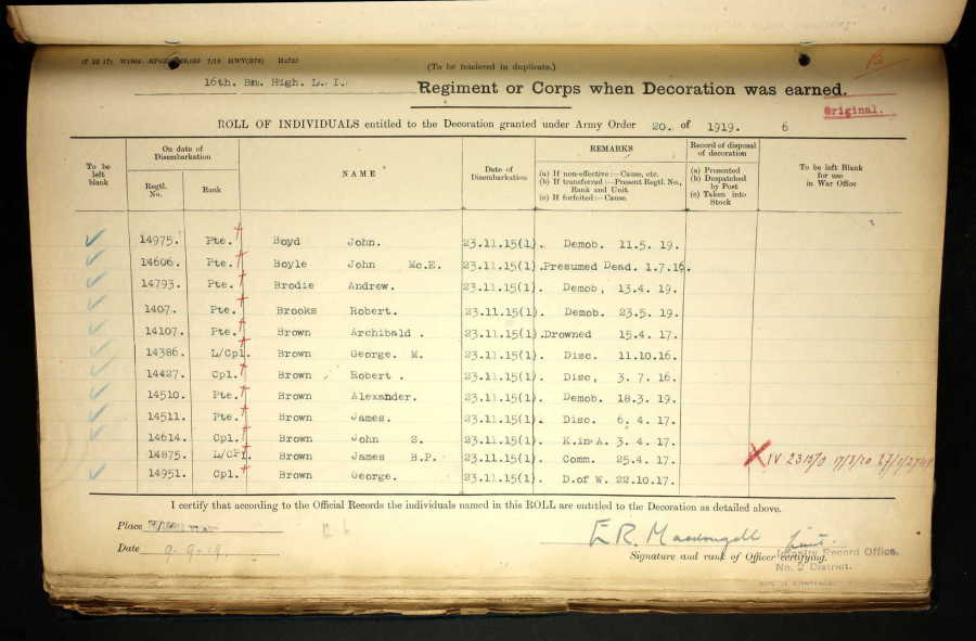 ARCHIBALD BROWN joined the 16th Bn Highland Light Infantry as Pte 14107, and went to France on 23rd November, 1915. At some point he was appointed Lance Corporal and was transferred to the 1st Bn HLI.
