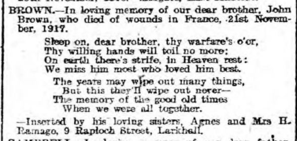 "BROWN - In loving memory of our dear brother, John Brown, who died of wounds in France, 21st November, 1917.