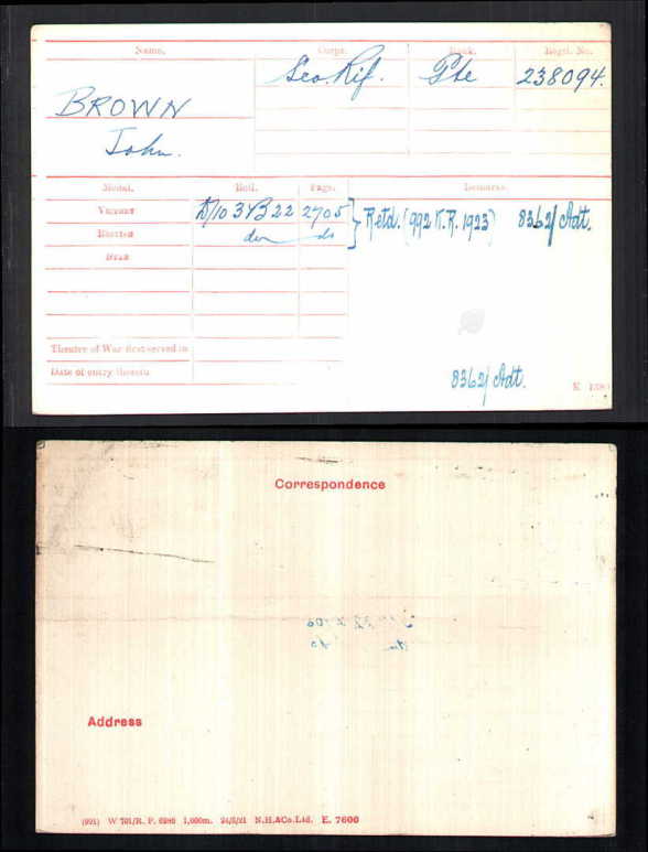 While researching JOHN, I found that his brother PETER WATSON BROWN served as Driver M/427604 of the Royal Army Service Corps. PETER was injured on 12th April, 1918, when a motor lorry ran over his foot. Due to his injuries he was evacuated back to the UK. He discharged on 16th July, 1918, because of his injuries.
