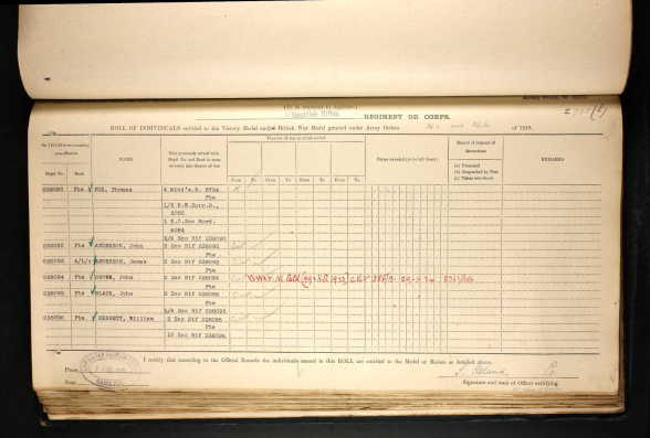 Medal Roll showing the award of The Victory Medal and The British War Medal.