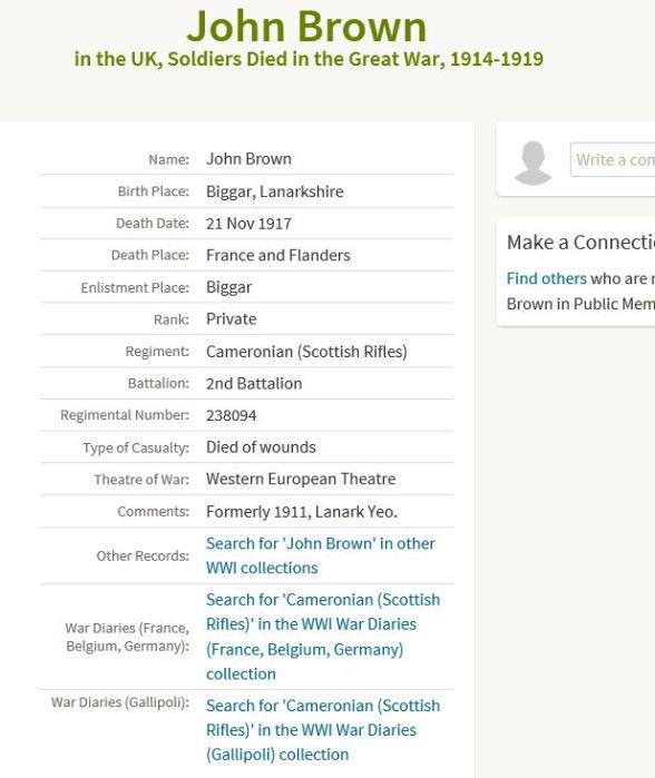 The entry in Soldiers Died in the Great War (SDGW) shows that JOHN was born and enlisted in Biggar. This record also shows that he formerly served as Private 1911, Lanarkshire Yeomanry.