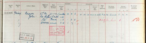 The "Soldier's Effects" record shows that his mother Annie received his Outstanding Pay of £5/14/10 and a War Gratuity of £6/-/-.