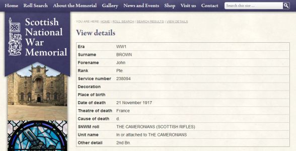 The Scottish National War Memorial (SNWM) at Edinburgh Castle shows that JOHN is commemorated there.