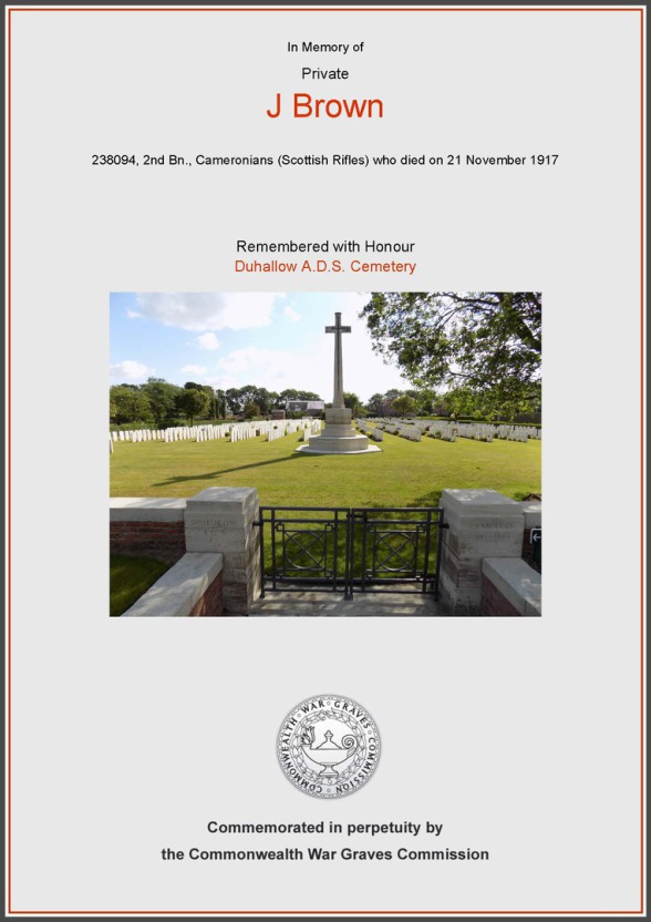 By searching the Commonwealth War Graves Commission (CWGC), I found that the only JOHN BROWN who died on 21st November, 1917, was JOHN BROWN, Pte 238094, 2nd Battalion, Cameronians (Scottish