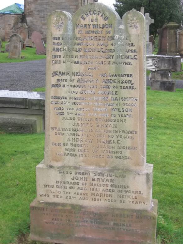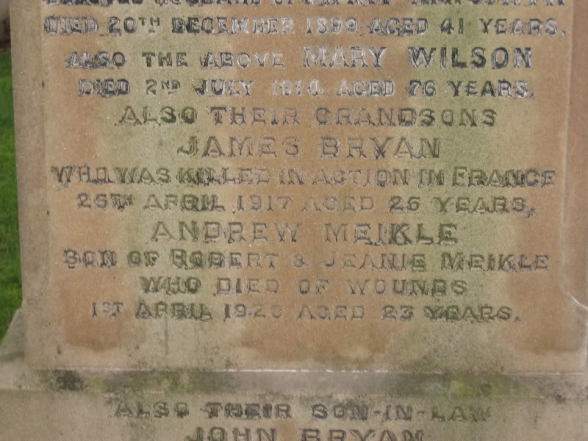The family gravestone indicated that JAMES was a grandson of Andrew Meikle and Mary Wilson. It also names his cousin
