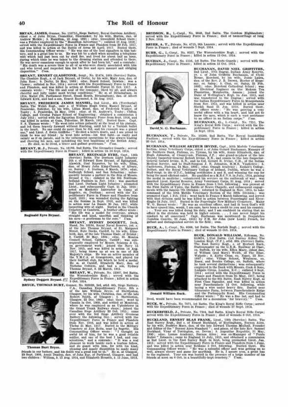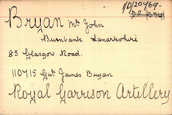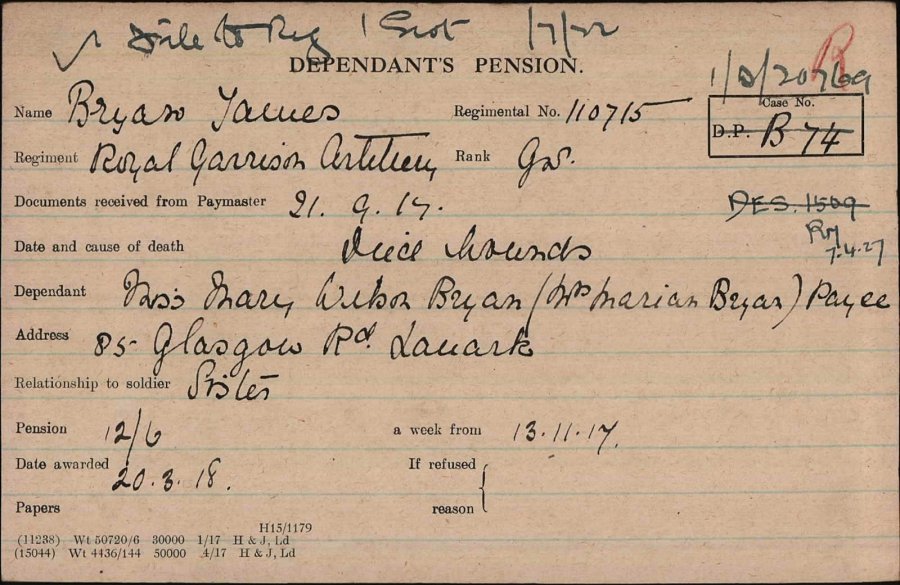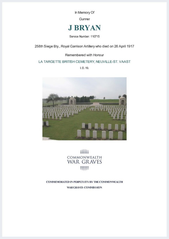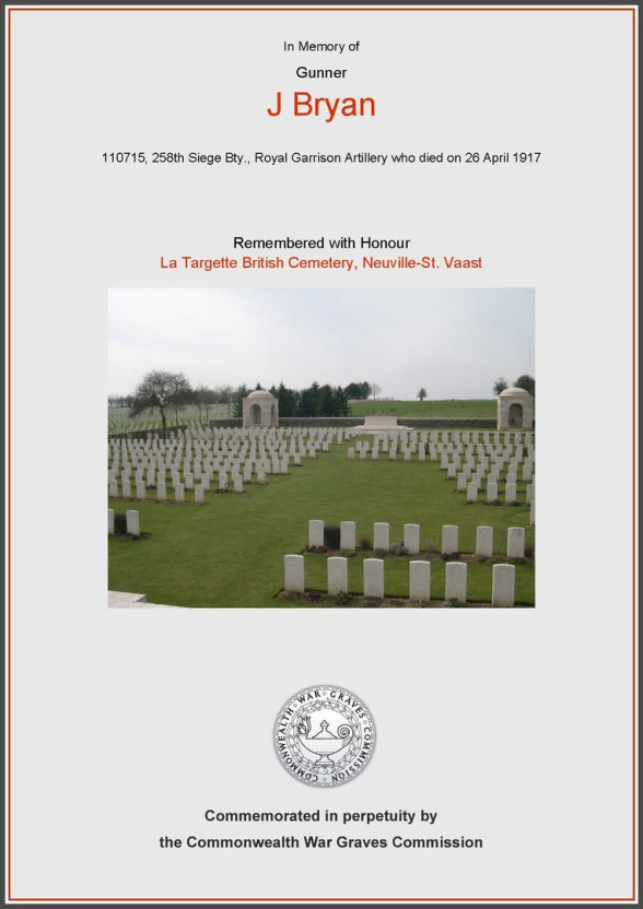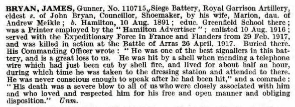JAMES BRYAN, Gnr 110715, 258th Siege Battery, Royal Garrison Artillery, is NOT named on the Larkhall War Memorial.