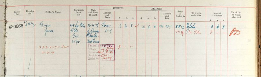 The "Soldier's Effects" record shows that his father John received his Outstanding Pay of £2/6/8 and a War Gratuity of £3/-/-.