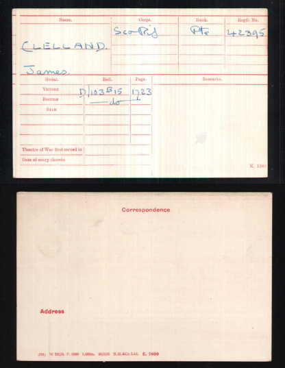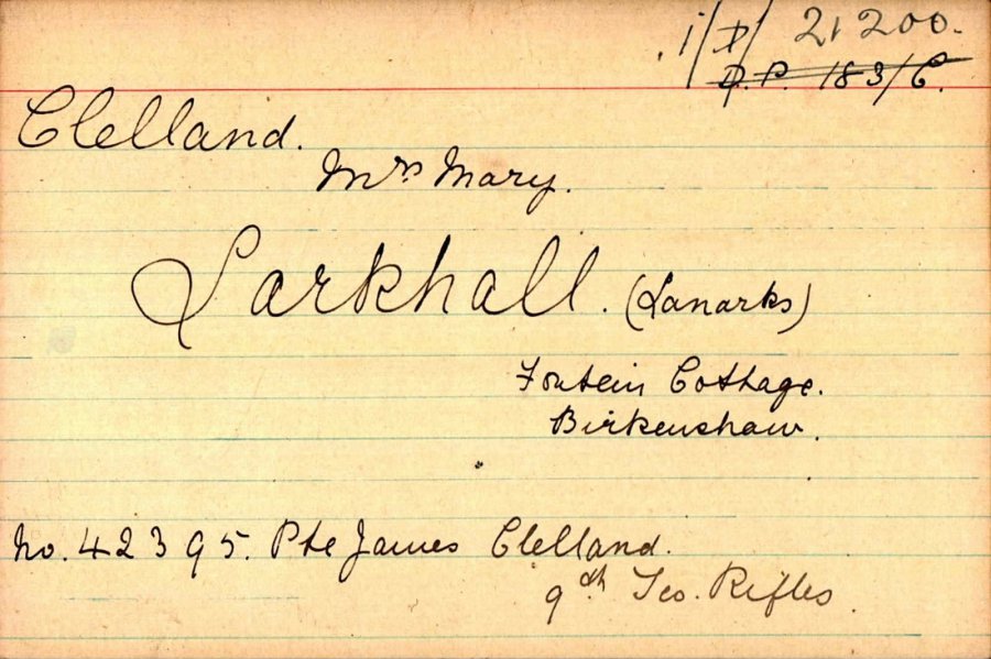 Other Info: | Son of Adam and Mary Clelland, of Birkenshaw, Larkhall, Lanarkshire. Native of Larkhall. |