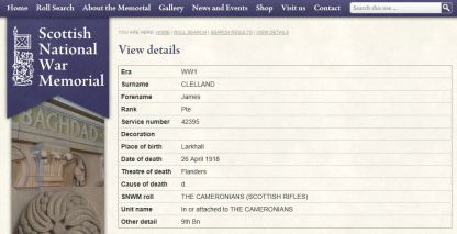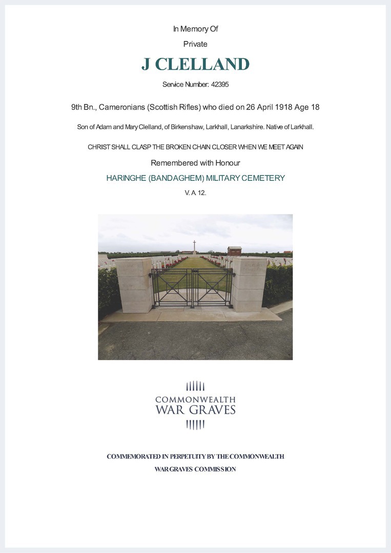 JAMES CLELLAND, Private 42395, 9th Battalion, Cameronians (Scottish Rifles), is NOT named on the Larkhall War Memorial.