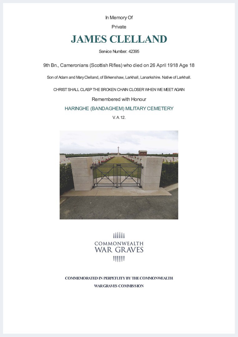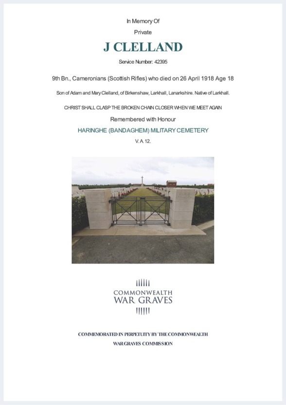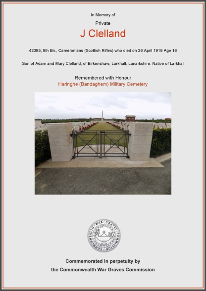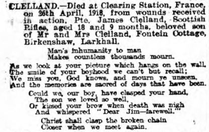 "CLELLAND - Died at Clearing Station, France, on 26th April, 1918, from wounds received in actions, Pte. James Clelland, Scottish Rifles, aged 18 and 9 months, beloved son of Mr and Mrs Clelland,