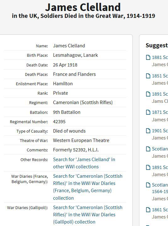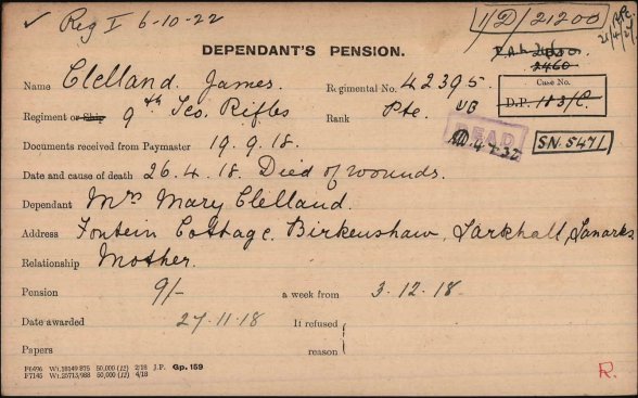 Mr and Mrs Clelland, Fontein Cottage, Birkenshaw, Larkhall, have received official intimation that their son, Private James Clelland, Scottish Rifles, died in a Casualty Clearing Station in France on