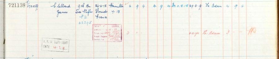 JAMES joined the 10/11th Battalion, Highland Light Infantry, as Private 52392. This was a Territorial Battalion, and he was later transferred to the 9th Battalion, Cameronians (Scottish Rifles) and renumbered as Private 42395.