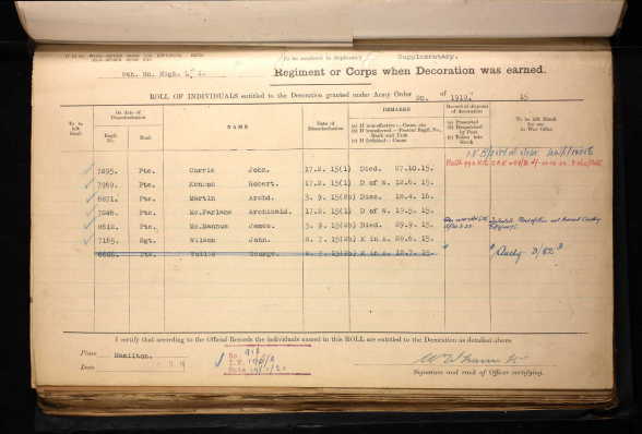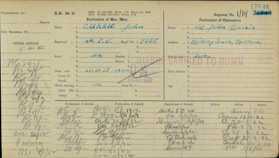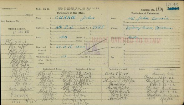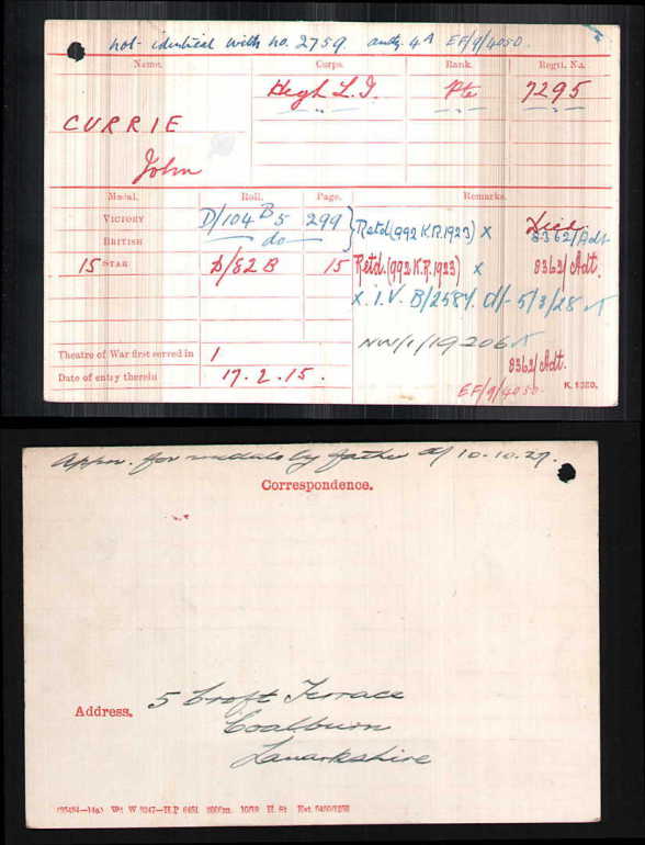 His father John applied to the War Office to have his son's medals sent to him at 5 Croft Terrace, Coalburn.