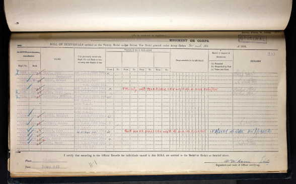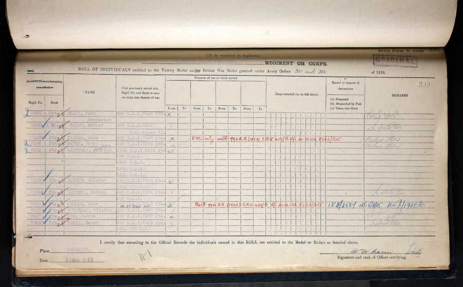 Medal Roll for the award of The Victory Medal and The British War Medal.