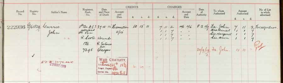 The "Soldier's Effects" record shows that his Outstanding Pay of £10/15/11 was distributed as follows: