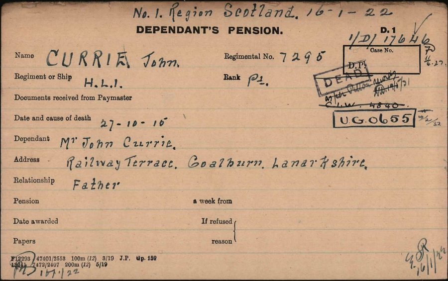 JOHN CURRIE Died of Wounds on 27 Oct 1915, age 19, at the Victoria Infirmary, Glasgow.