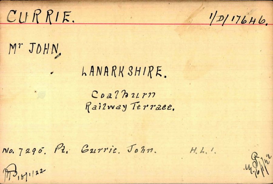 His parents were John Currie, a Bottomer in a Coal Pit, and Marion Stewart Scott who were married at Crossford on 1 Feb 1895.