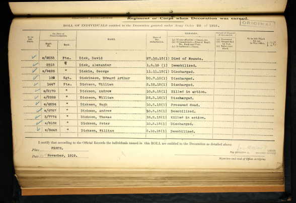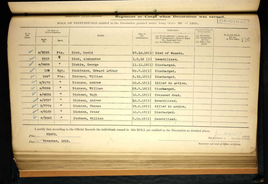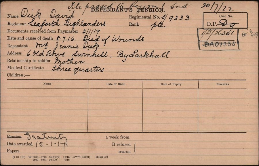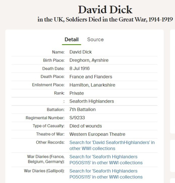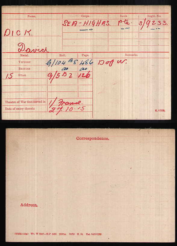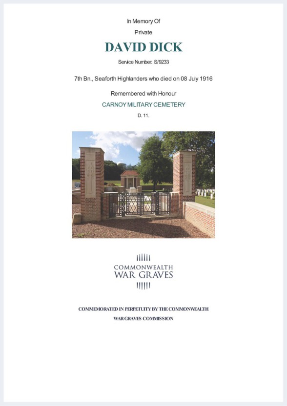 DAVID DICK joined the 7th Battalion, Seaforth Highlanders, as Private S/9233, and went to France on 27 Oct 1915.