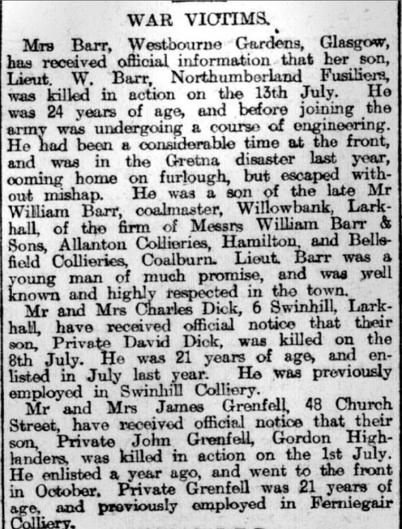 Mr and Mrs Charles Dick, 6 Swinhill, Larkhall, have received official notice that their son, Private David Dick, was killed on the 8th July. He was 21 years of age, and enlisted in July last year. He