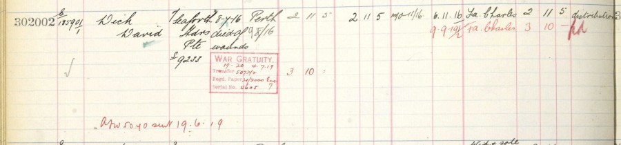 The "Soldier's Effects" record shows that his father Charles received his Outstanding Pay of £2/11/5 and a War Gratuity of £3/10/-.