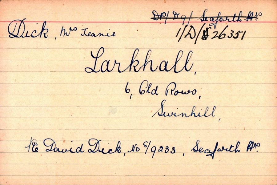 A Dependant's Pension Record Card and Pension Address Card shows that his mother was living at 6 Old Rows, Swinhill, By Larkhall.