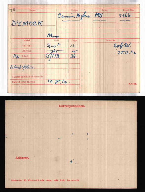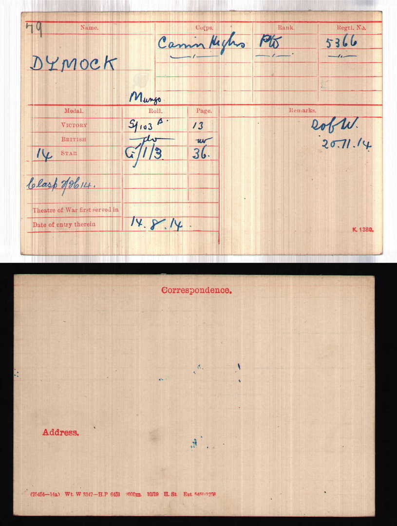 The Medal Rolls Index Card (MIC) for MUNGO DYMOCK shows that he was awarded The 1914 Star Medal, The Victory Medal and The British War Medal. The MIC is dated 14th August, 1914, and shows that he went to France on that date.