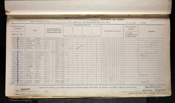 Medal Roll showing the award of The Victory Medal and The British War Medal.