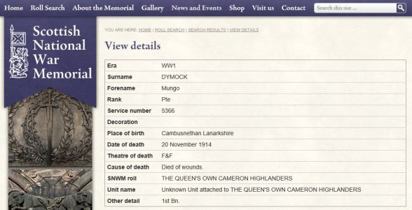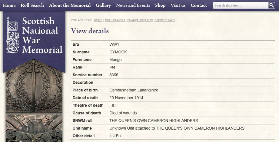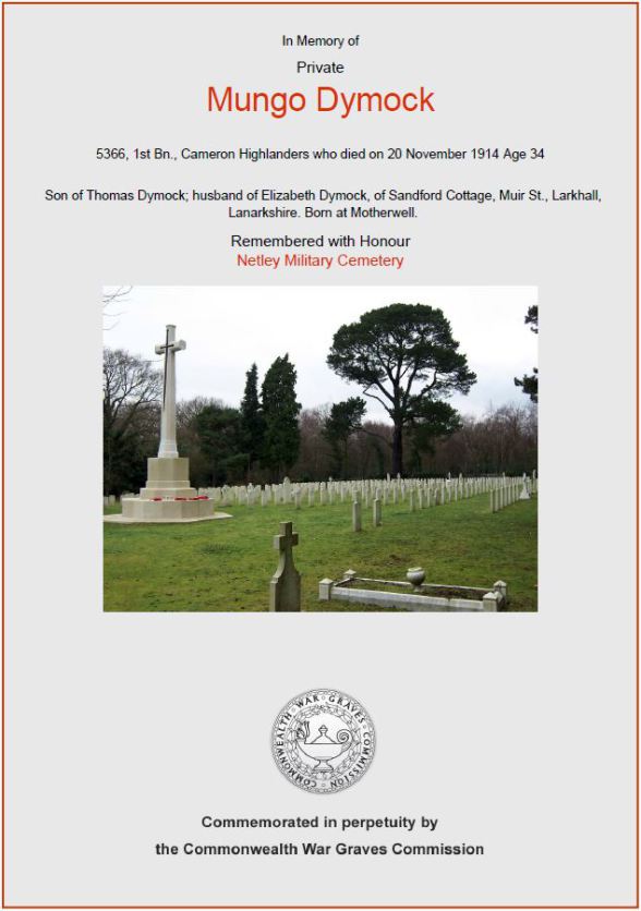 MUNGO DYMOCK, Private 5366, 1st Battalion, Cameron Highlanders, is NOT named on the Larkhall War Memorial. He is listed on Motherwell War Memorial (see attached). His connection to Larkhall is his wife Elizabeth Davidson, and their children.