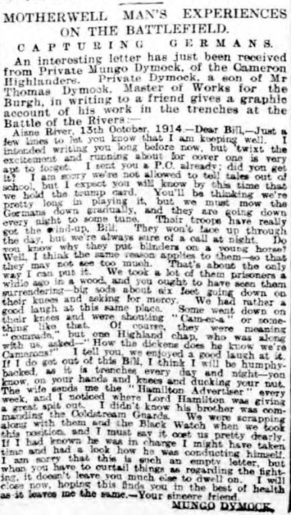 An interesting letter has just been received from Private Mungo Dymock, of the Cameron Highlandes. Private Dymock, a son of Mr Thomas Dymock, Master of Works for the Burgh, in writing to a friend