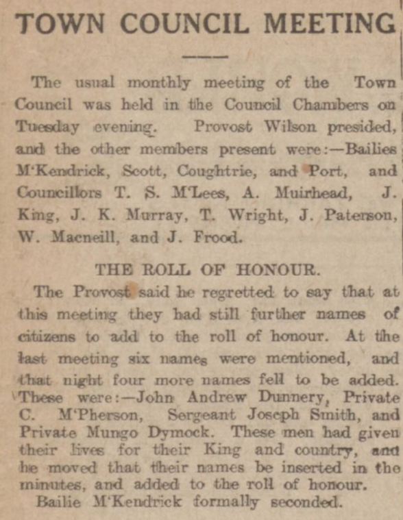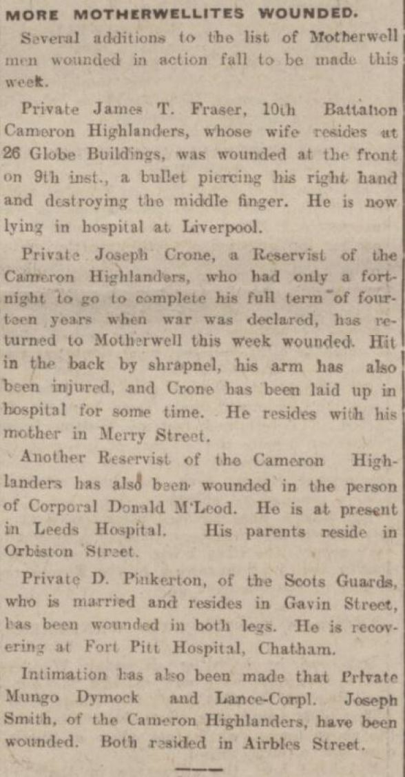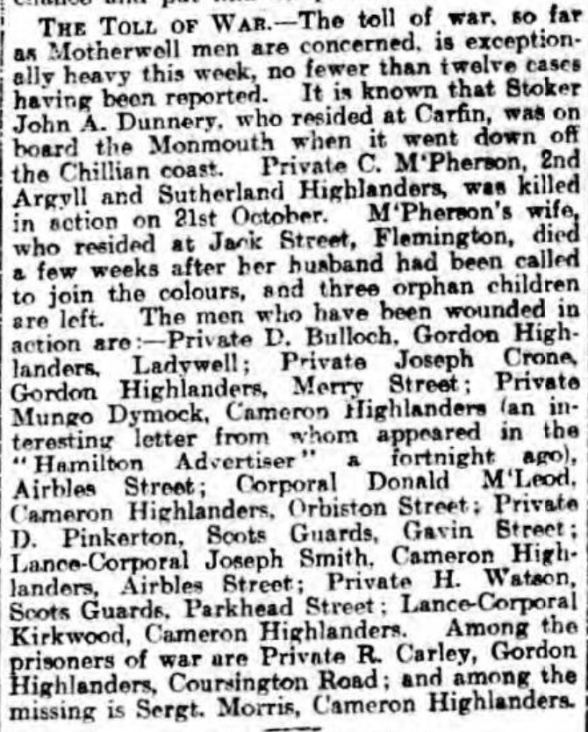 Intimation has also been made that rivate Mungo Dymock and Lance-Corpl. Joseph Smith, of the Cameron Highlanders, have been wounded. Both resided in Airbles Street".