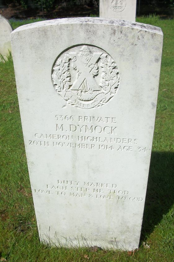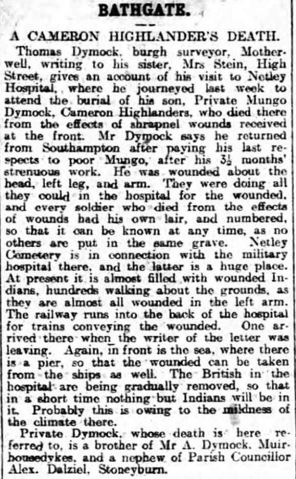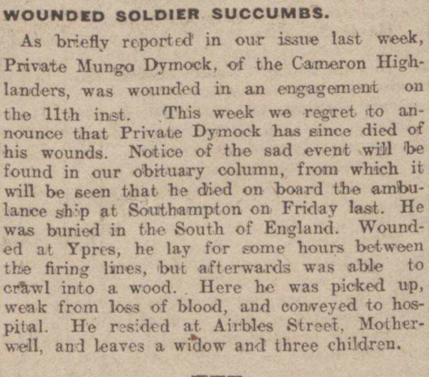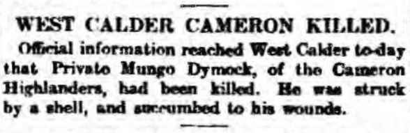 Official information reached West Calder today that Private Mungo Dymock, of the Cameron Highlanders, had been killed. He was struck by a shell, and succumbed to his wounds".