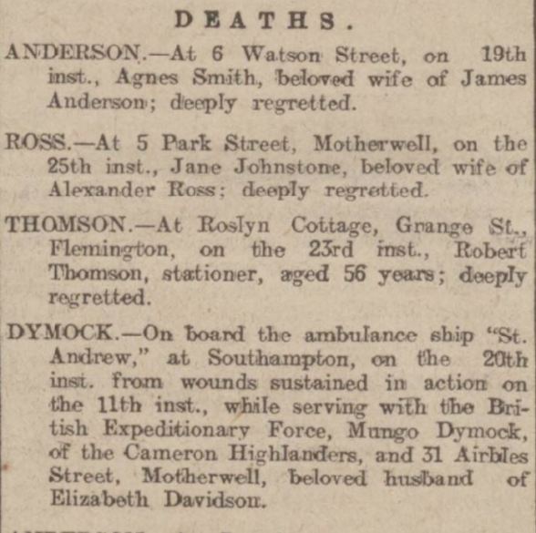 Dymock, of the Cameron Highlanders, and 31 Airbles Street, Motherwell, beloved husband of Elizabeth Davidson.".