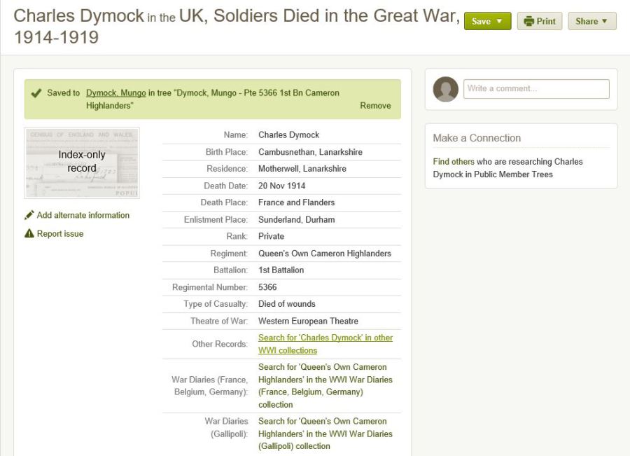 The entry in Soldiers Died in the Great War (SDGW) shows that MUNGO DYMOCK was born in Cambusnethan, lived in Motherwell, and enlisted in Sunderland, Durham.