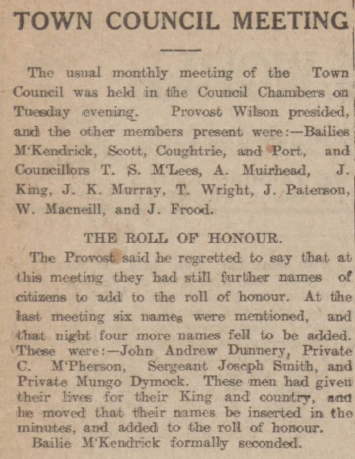 The Provost said he regretted to say that at this meeting they had still further names of citizens to add to the roll of honour. At the last meeting six names were mentioned, and that night four more
