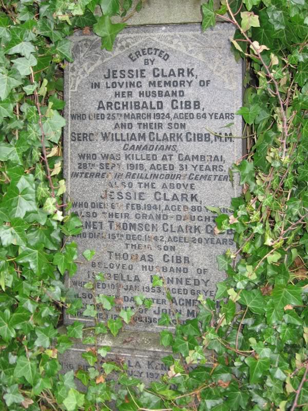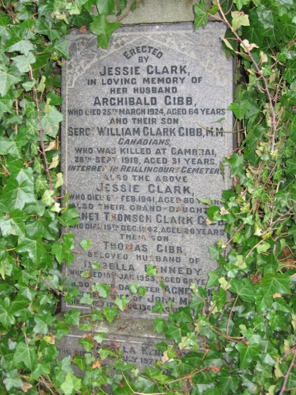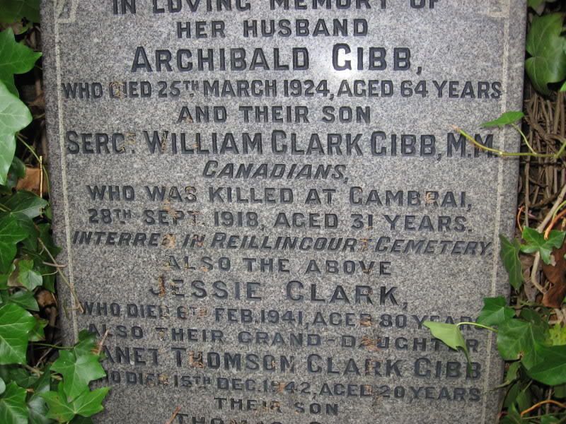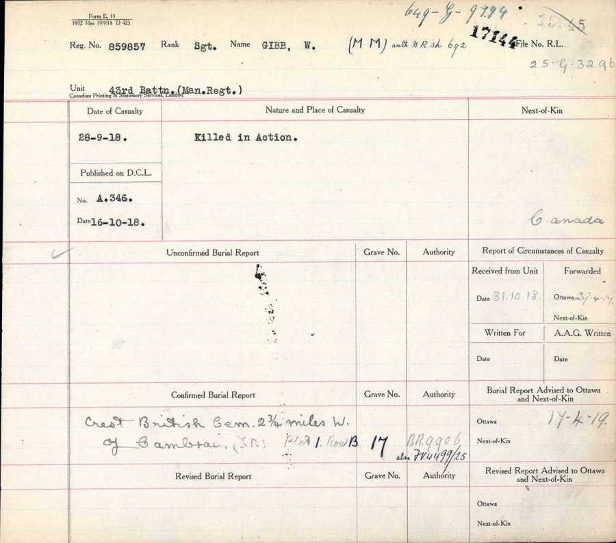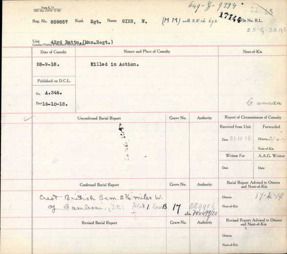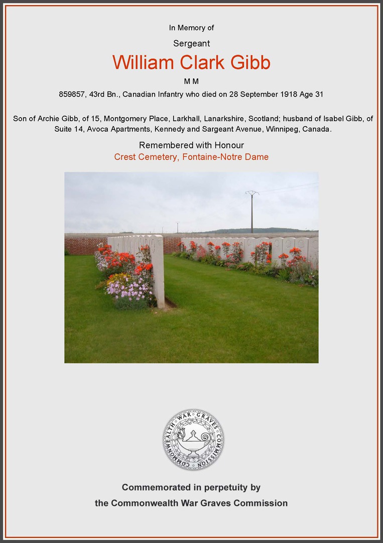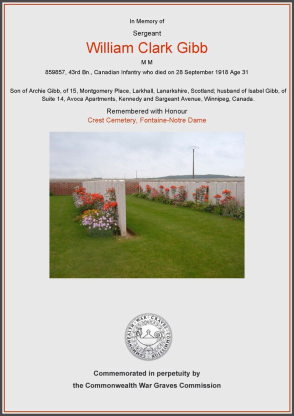 "GIBB - Killed in action on the 28th September, Sergeant William Clark Gibb, M.M., Cameron Highlanders of Canada, age 31 years, husband of Isobel Robertson, Winnipeg, and second son of Mr and Mrs