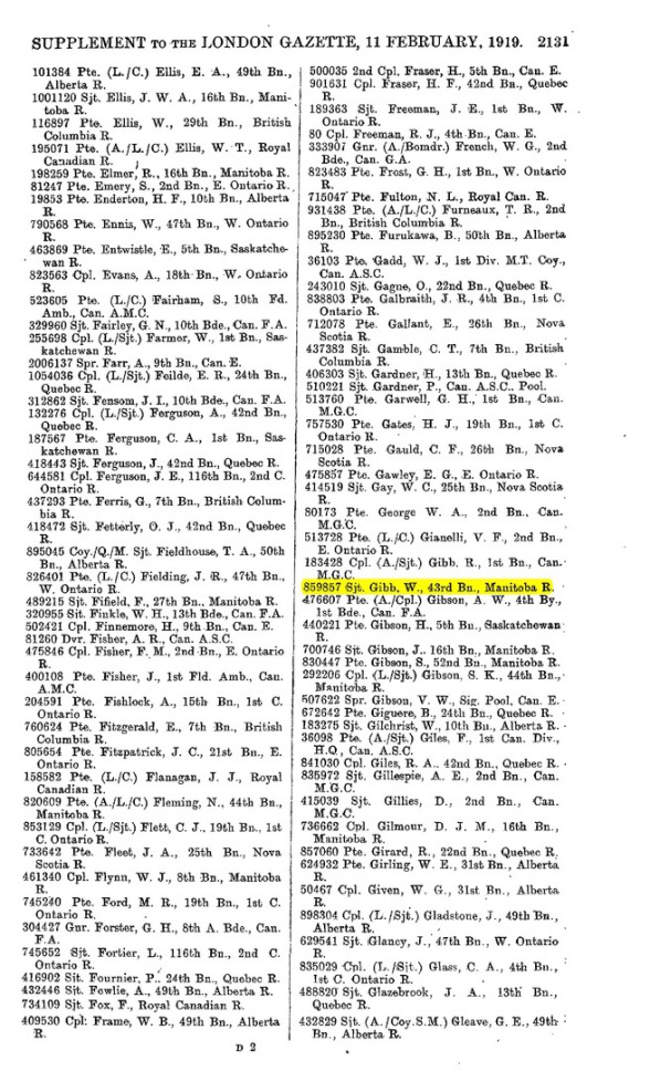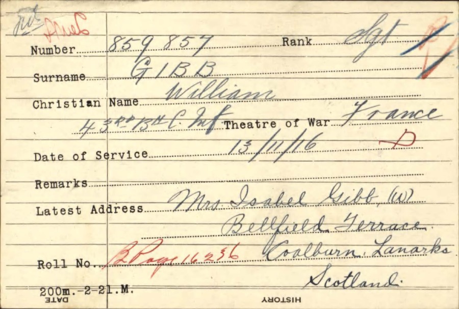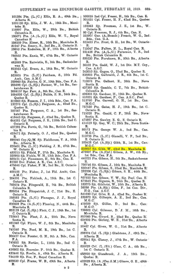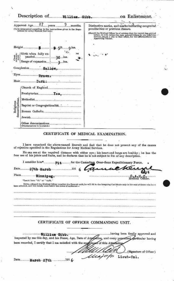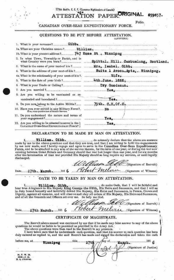 WILLIAM GIBB, M.M. joined the 179th Bn Cameron Highlanders of Canada as Pte 859857 on 27th March, 1916, at Winnipeg, Canada.
