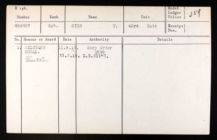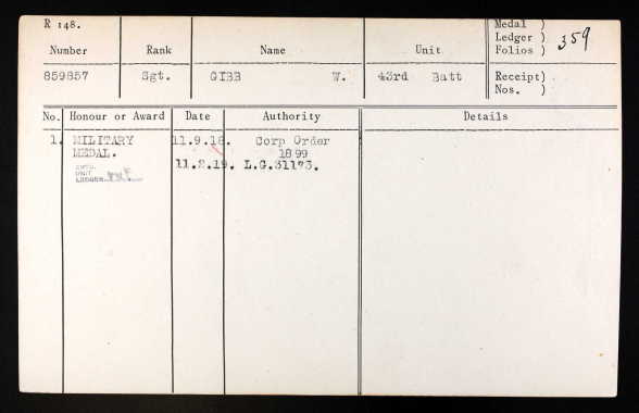 The Medal Rolls Index Card (MIC) for WILLIAM GIBB, M.M. shows that he was awarded The 1914-15 Star Medal, The Victory Medal and The British War Medal.