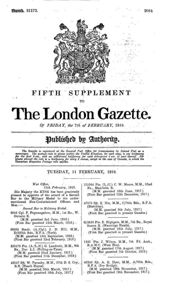 Pages from The London Gazette, Number 31173, dated 7th February, 1919.