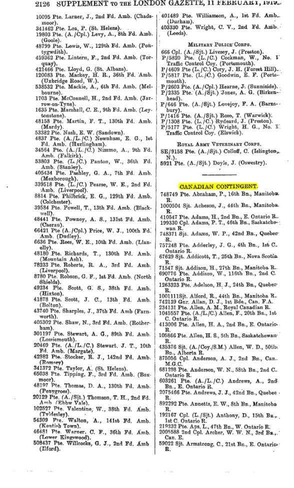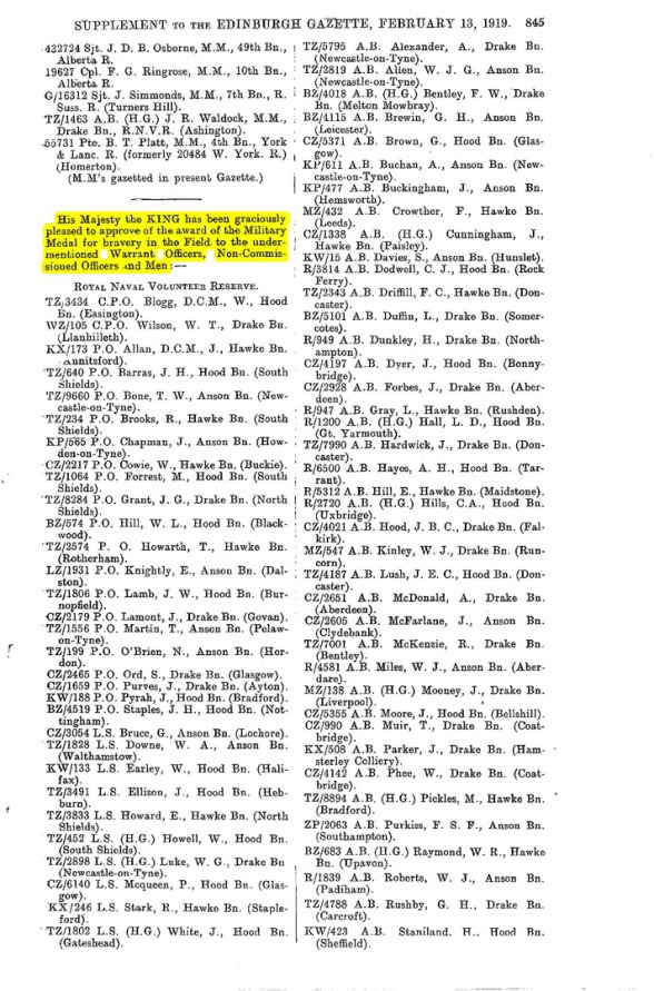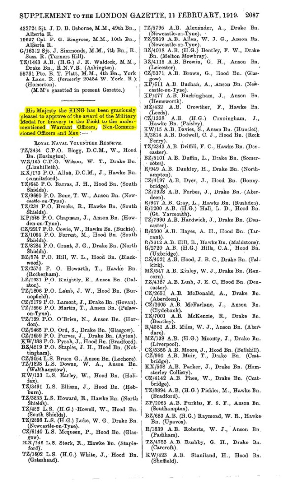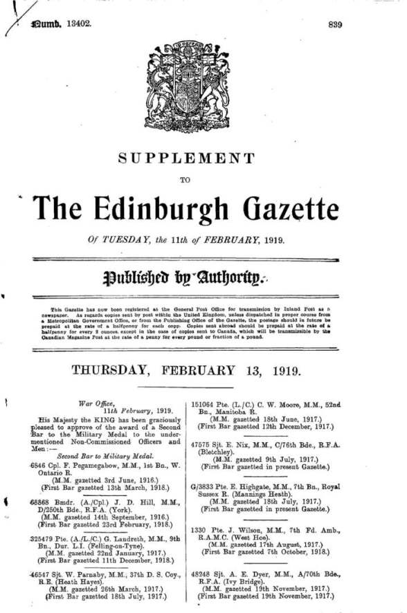 This was announced in The London Gazette, Number 31173, dated 7th February, 1919, and The Edinburgh Gazette, Number 13402, dated 11th February, 1919.