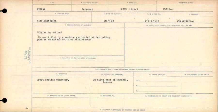 The Canadian War Graves Register shows that "He was killed by a machine gun bullet whilst taking part in an attack South of Raillencourt".